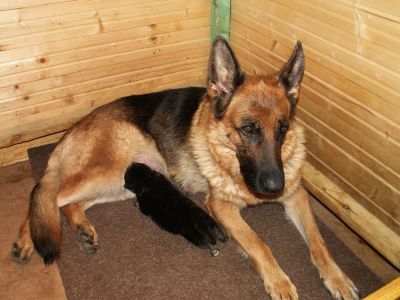 Cora von der Waldesruh mit ihrem Welpen eine Woche alt
